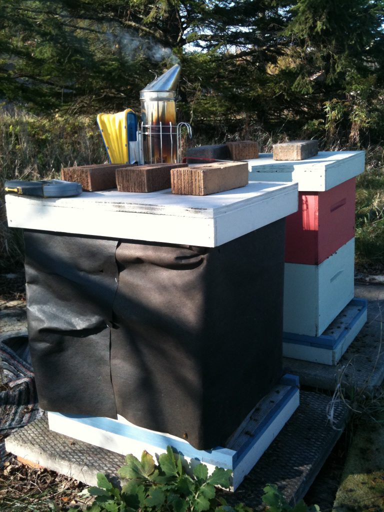 The time had come. Colder weather, shorter days… winter is coming and the honeybees needed more substantial protection than what their hive alone could provide. Enter tar paper (above), saved from last year. You can tell by the grooves and the tiny hole that it had already been used for this purpose. That made putting it on the hives a bit easier than last year, when I was fighting with a large roll of the stuff while trying not to get stung. This time I just followed the grooves and lined up the holes with the upper exits of the hives. Easy peasy.